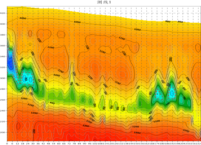 結(jié)合客戶所提供資料,從圖中可看出,高程310米-350米,點(diǎn)號(hào)0-6處、高程290米-310米,點(diǎn)號(hào)18-30處、高程260米-280米,點(diǎn)號(hào)170-180處,點(diǎn)號(hào)186-196處為低阻采空區(qū)異常主要出現(xiàn)在紅色虛線位置,與實(shí)際情況完全吻合。